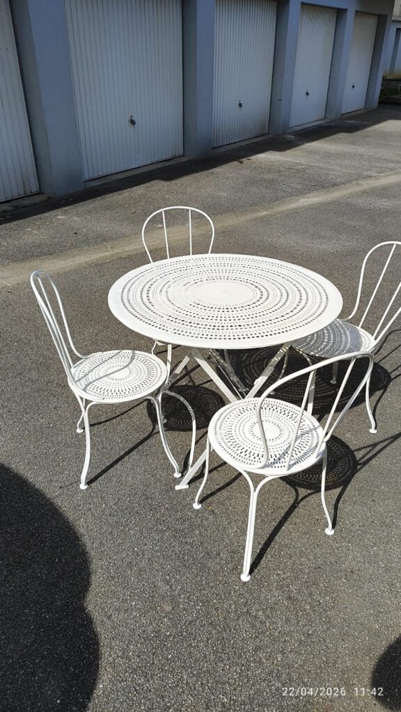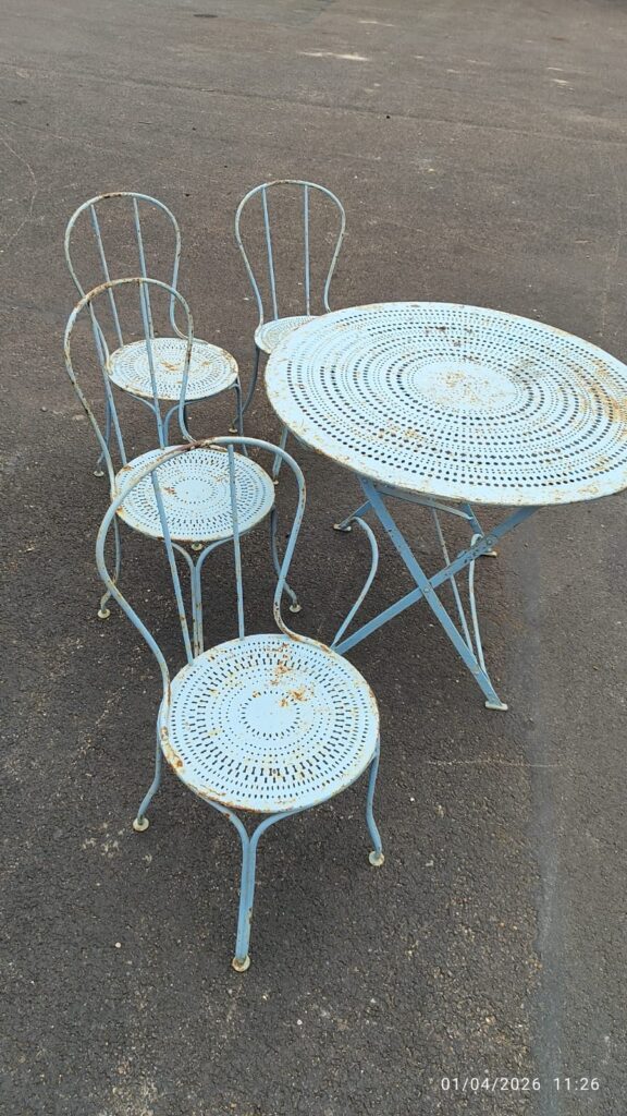 Chez MS Peinture, nous intervenons également sur la rénovation de mobilier métallique, même lorsqu’il est fortement dégradé. Récemment, nous avons été sollicités pour redonner vie à une table et quatre chaises en fer particulièrement abîmées par le temps et les intempéries.